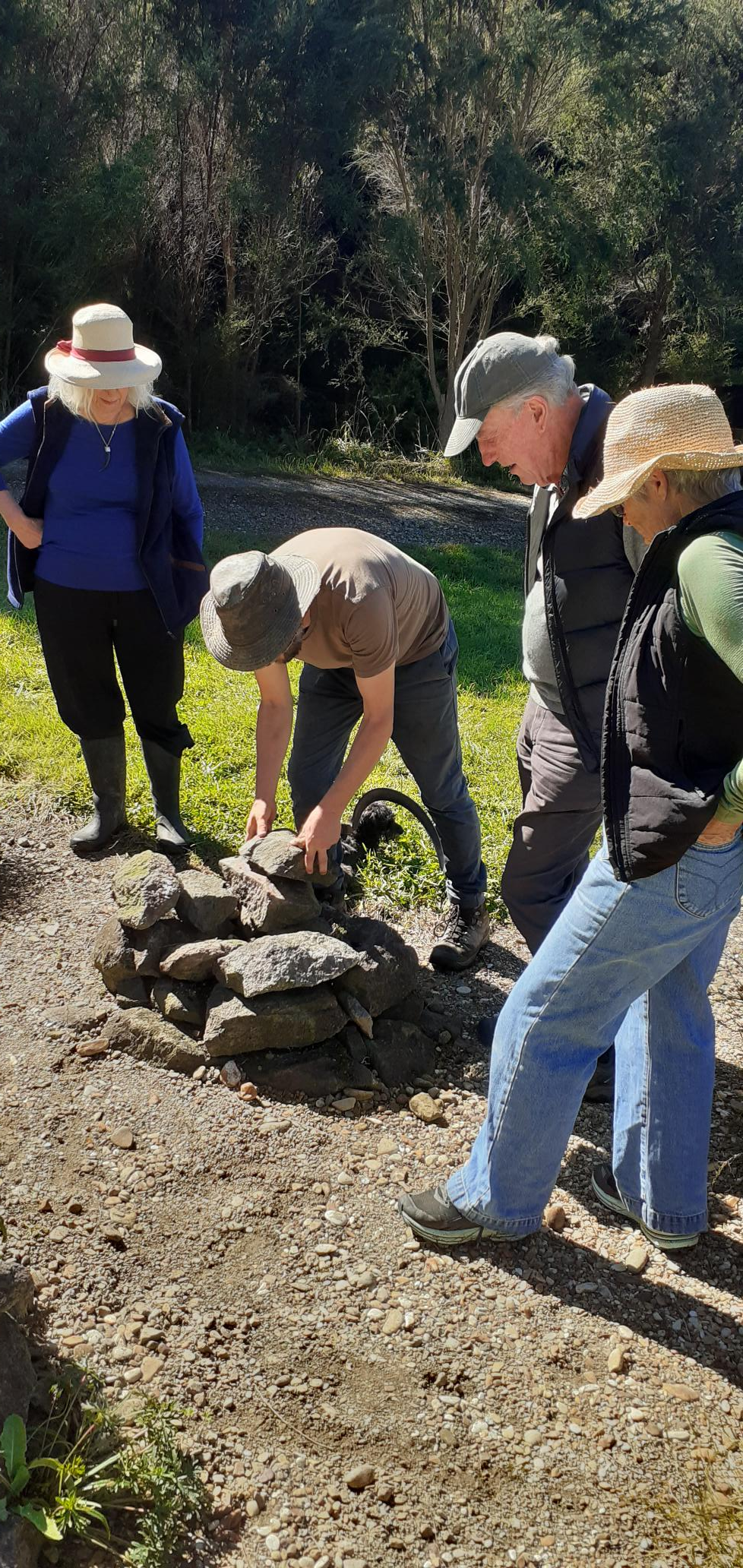 Dr John Craig and Anne Stewart with Malcolm Rutherford, inspecting the stone mounds with their rare Tairawhiti plants: