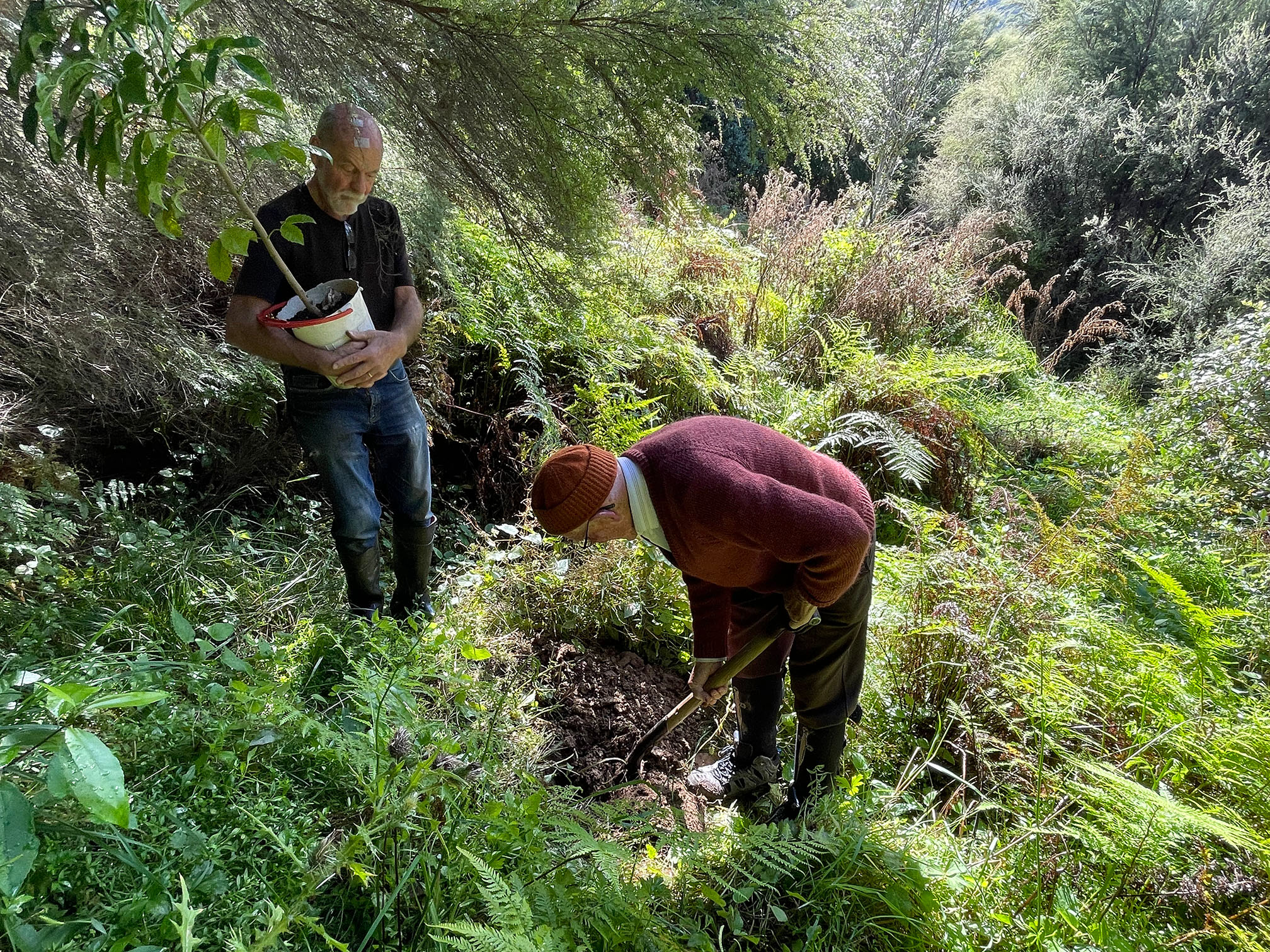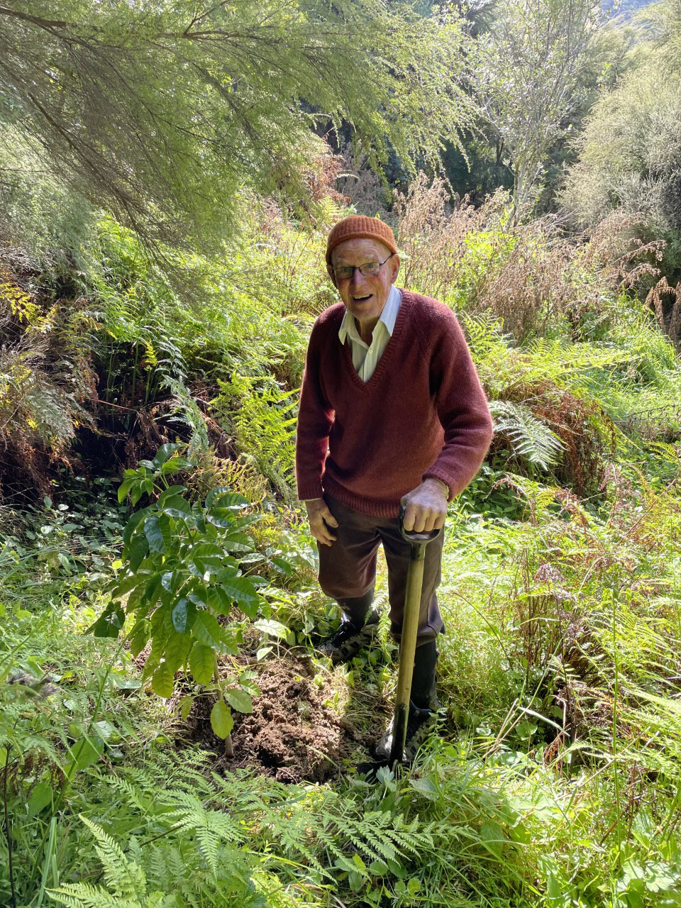 Dave Hughes, who’s in his nineties, is a legend at Waikereru. He’s been planting trees here and populating the streams with eels for the past twenty years, Dave is a keen tramper, still rides his motorbike and has unrivalled knowledge of the bush. He used to trap possums at Waikereru in his teens! Many years ago, he also won the Cresswell Cup for a race from the bottom of Motukeo to the top, back down again and across the swingbridge to the top of Pukeaikuri on our land. This is his latest gift to Waikereru, two puriri trees.