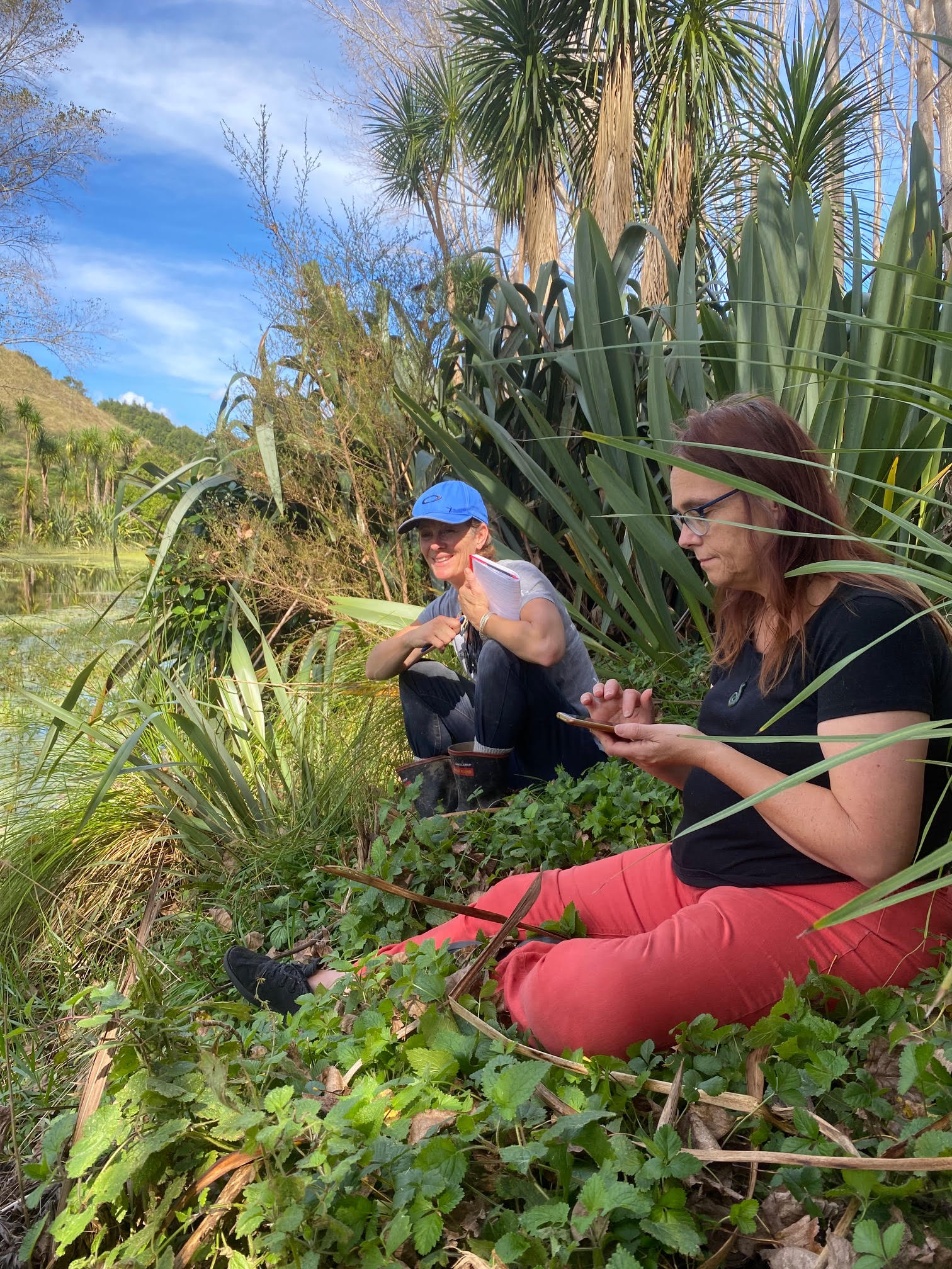 Robyn Wilkie and Lois Easton working out how best to plant up the pond and our wetlands at Waikereru, funded by a grant from the Gisborne District Council Conservation Fund. Thanks, GDC!