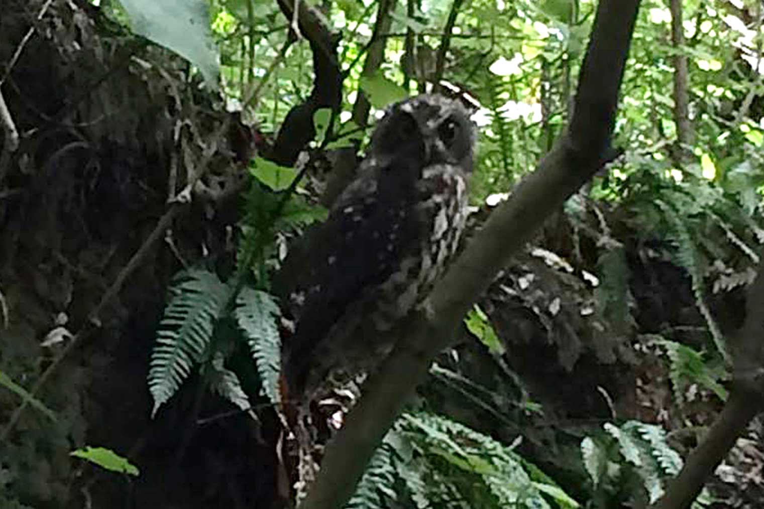 Steve and Tim Salmond were standing on the Waitui bridge at midday when this ruru flew under the bridge and perched on a nearby tree. We think it’s a young ruru that our neighbours found on the roadside with an infected eye. They took it home, treated it and fed it, then released it in Longbush. This may be why the bird was flying during the day, and is unafraid of people.