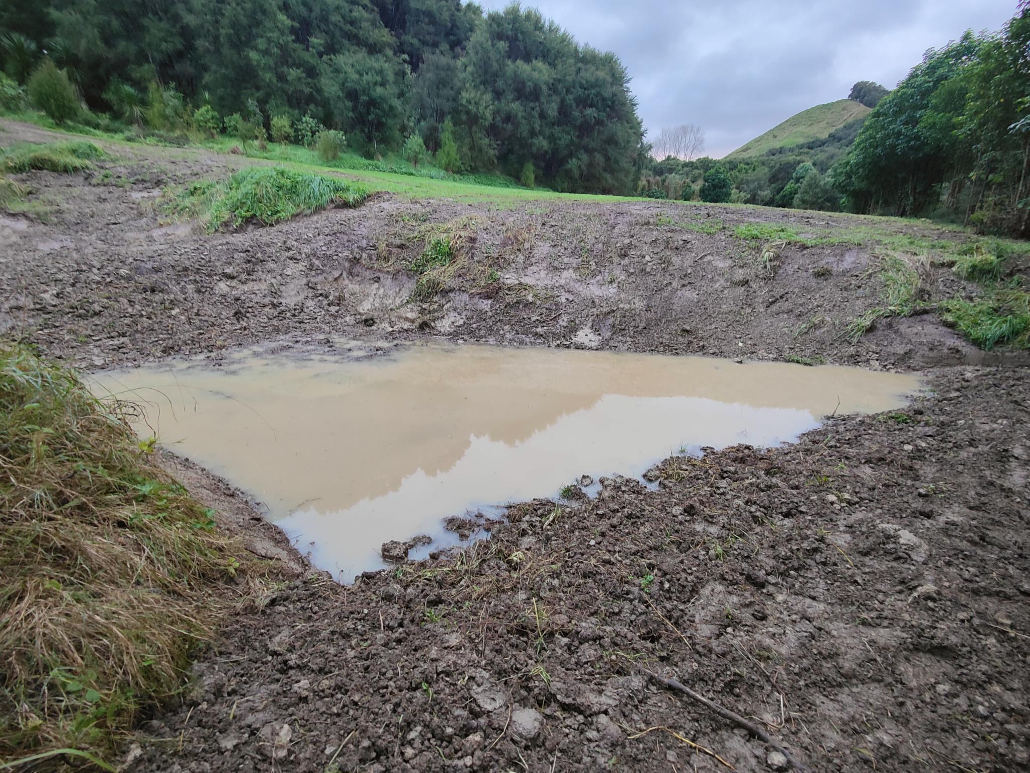 Another cause for celebration - the lower pond in the new wetland works, with no lining. The upper pond will need a lining, however.